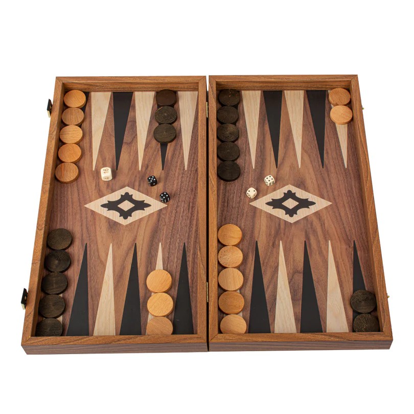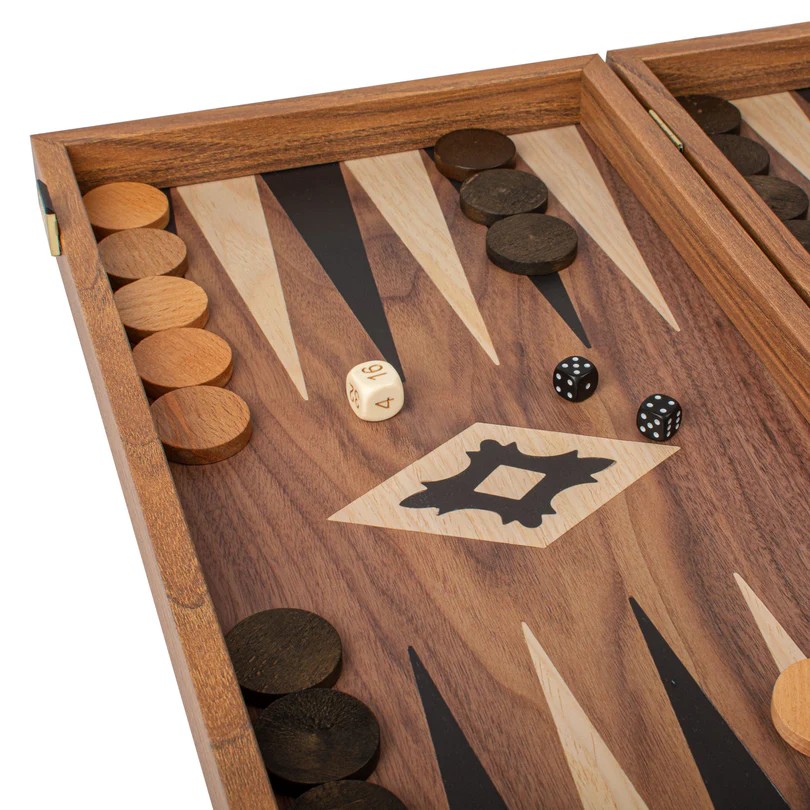 Το σετ τάβλι σε χρώμα καρυδιάς διαθέτει μια τυπωμένη (όχι ένθετη) επιφάνεια παιχνιδιού που αναδεικνύει ένα όμορφο σχέδιο με τα νερά του ξύλου. Οι μαύρες και δρύινες μύτες σε αντίθεση προσφέρουν μια εντυπωσιακή οπτική ελκυστικότητα, βελτιώνοντας τόσο την εμφάνιση όσο και την παιχνιδιάρικη εμφάνιση του ταμπλό.