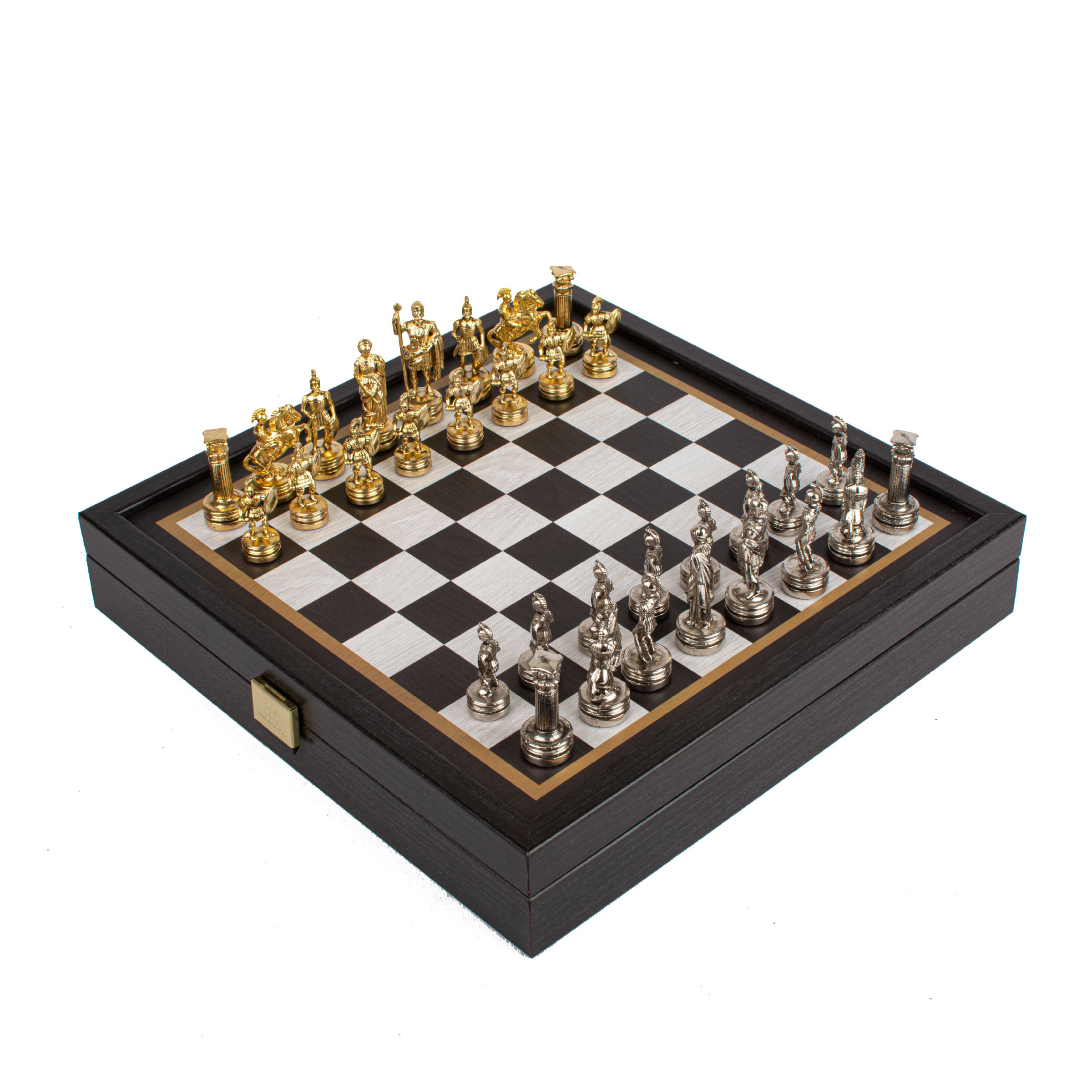 Μεταλλικά πιόνια ΣΤΡΑΤΙΩΤΗΣ [SK-91] με ενσωματωμένη μπρούτζινη σκακιέρα, σε ξύλινη κασετίνα